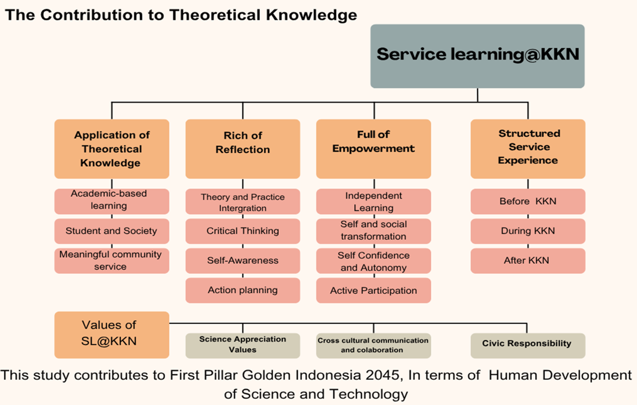 Incorporating service learning into KKN programs will help produce graduates with strong academic qualifications who are well-prepared to contribute to a multicultural society. This effort matches the broader goal of transforming higher education and supports the realization of the first pillar of Golden Indonesia 2045: advancing human development and the progress of science and technology.
