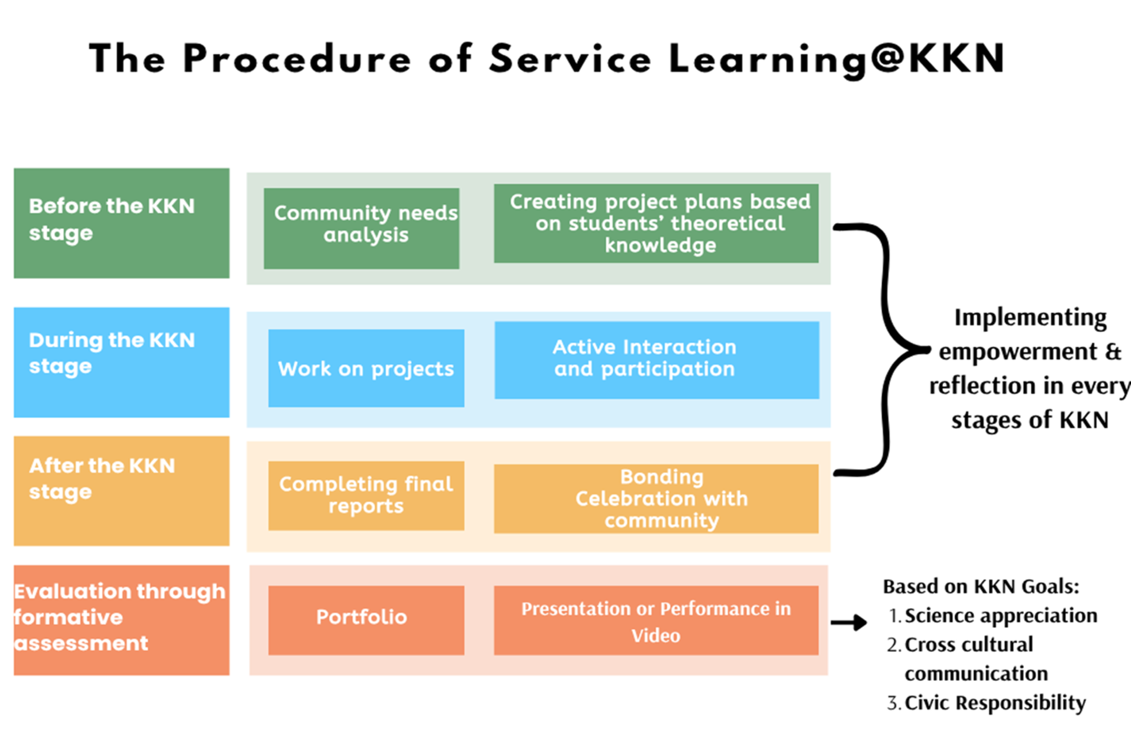 The findings of this study suggest procedures for improving KKN implementation in higher education, which could strengthen its role as a service-learning approach in Indonesia. Service learning encourages students to apply theoretical knowledge, values, and skills within real-world community contexts, thereby supporting and strengthening local communities. The figure below presents an overview of the study’s results and outlines a procedure for implementing service learning in Indonesia. This approach seeks to enhance KKN by transforming it into an innovative pedagogy that positively impacts both students and the community.